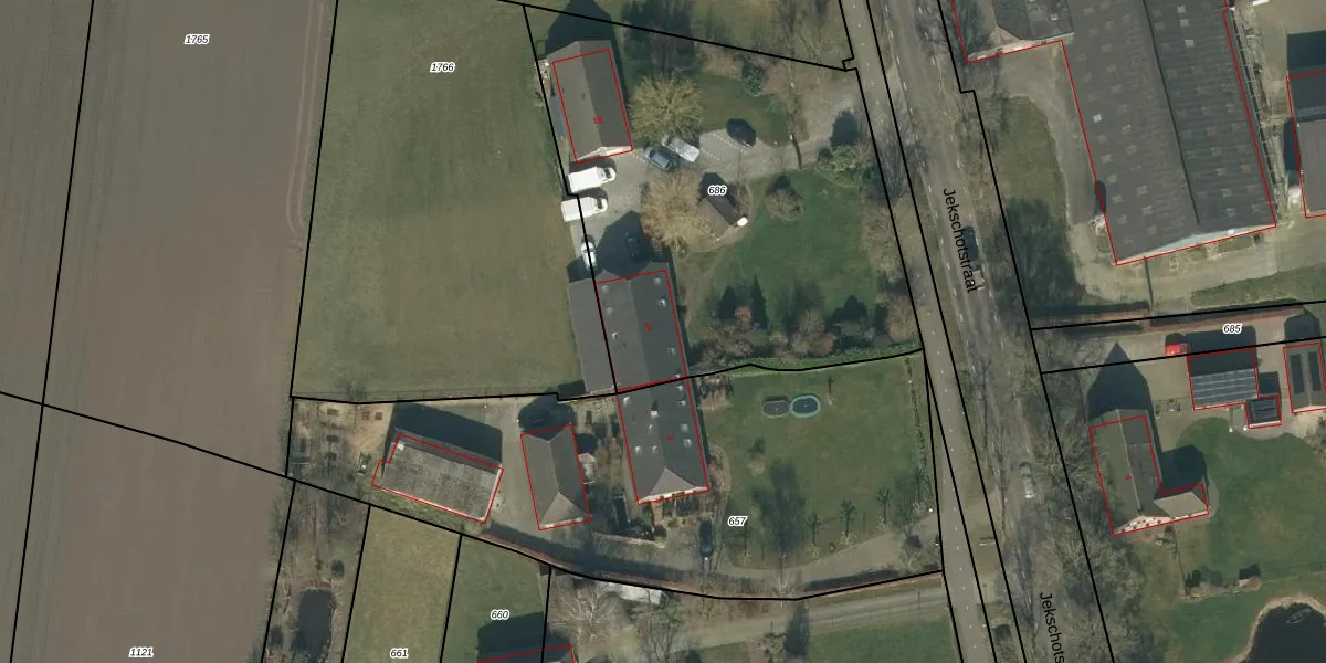 Het perceel waarop Jekschotstraat 1-A staat heeft een oppervlakte van 2380 m². Dit is een zeer groot perceel. De perceeloppervlakte wordt geregistreerd door het Kadaster. Gedetailleerde informatie over de maten van dit perceel kunt u vinden in het rapport Kadastrale kaart met maatvoering van Jekschotstraat 1-A.
