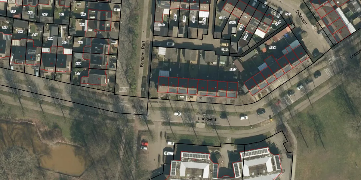 Het perceel waarop Lookveld 32 staat heeft een oppervlakte van 2425 m². Dit is een zeer groot perceel. De perceeloppervlakte wordt geregistreerd door het Kadaster. Gedetailleerde informatie over de maten van dit perceel kunt u vinden in het rapport Kadastrale kaart met maatvoering van Lookveld 32.