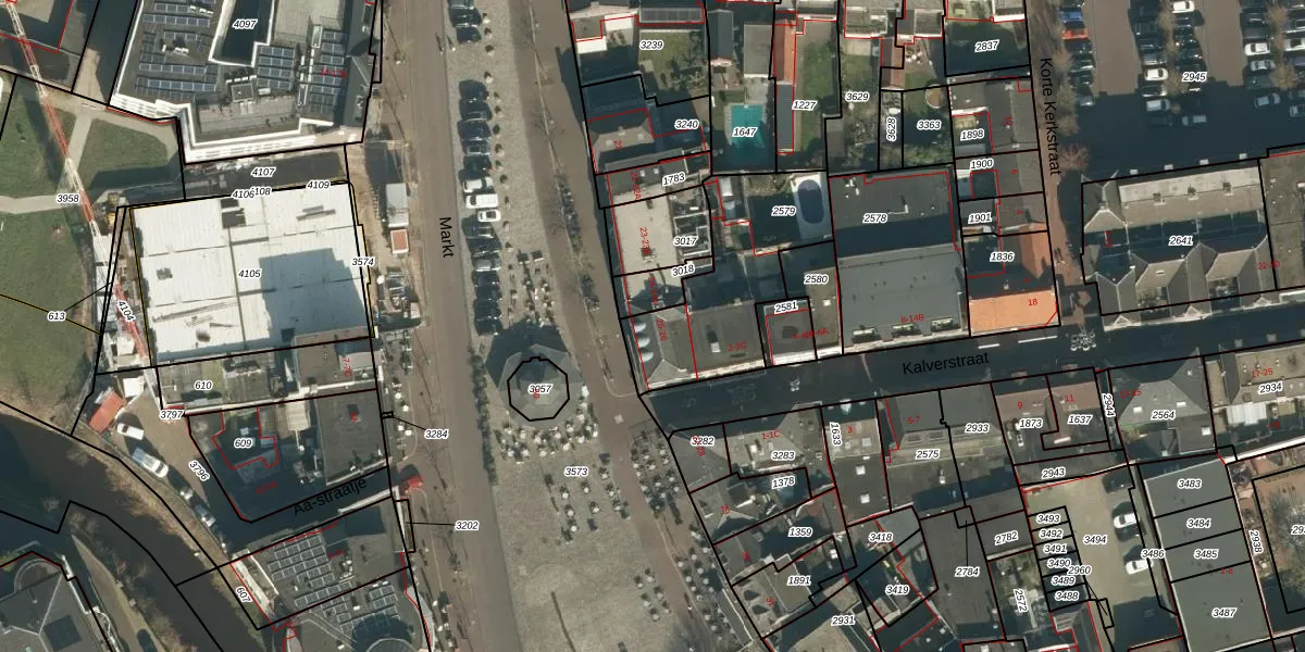 Het perceel waarop Markt 25 staat heeft een oppervlakte van 549 m². Dit is een groot perceel. De perceeloppervlakte wordt geregistreerd door het Kadaster. Gedetailleerde informatie over de maten van dit perceel kunt u vinden in het rapport Kadastrale kaart met maatvoering van Markt 25.