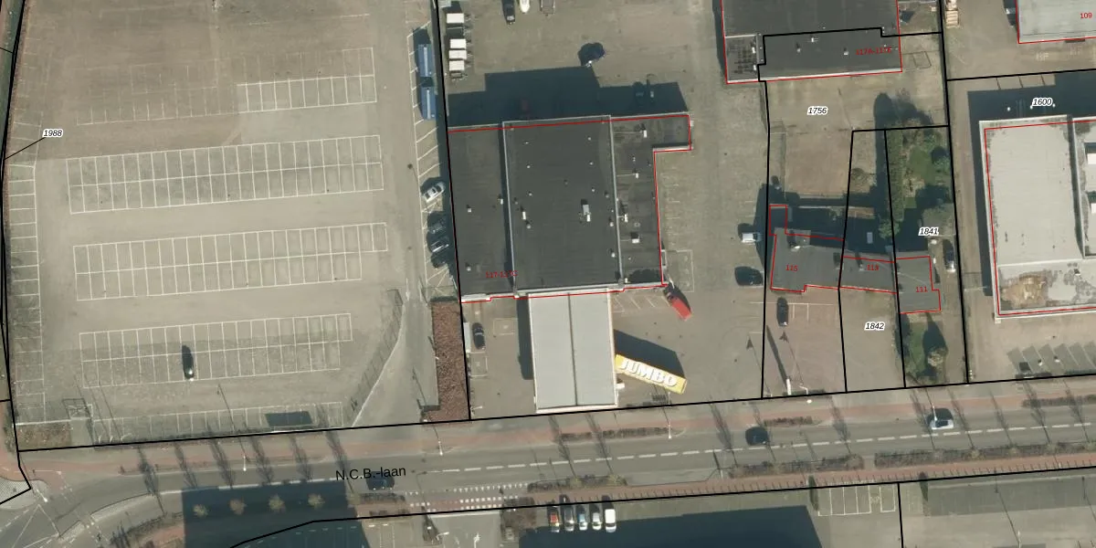 Het perceel waarop N.C.B.-laan 117 staat heeft een oppervlakte van 1,2 ha. Dit is een zeer groot perceel. De perceeloppervlakte wordt geregistreerd door het Kadaster. Gedetailleerde informatie over de maten van dit perceel kunt u vinden in het rapport Kadastrale kaart met maatvoering van N.C.B.-laan 117.