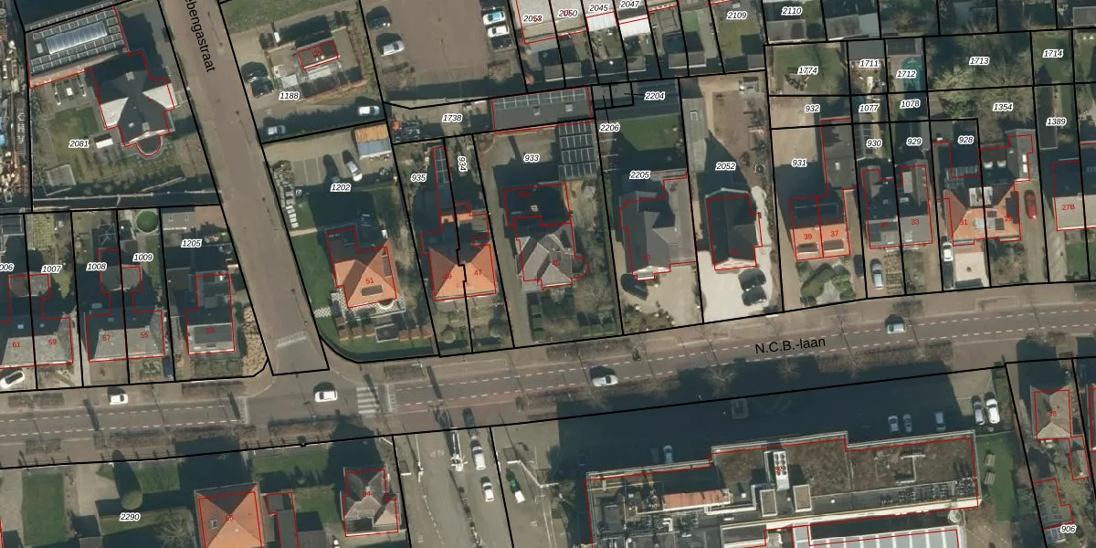 Het perceel waarop N.C.B.-laan 45 staat heeft een oppervlakte van 857 m². Dit is een groot perceel. De perceeloppervlakte wordt geregistreerd door het Kadaster. Gedetailleerde informatie over de maten van dit perceel kunt u vinden in het rapport Kadastrale kaart met maatvoering van N.C.B.-laan 45.