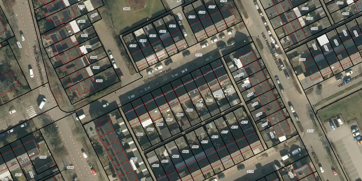 Het perceel waarop Schoutenstraat 11 staat heeft een oppervlakte van 165 m². Dit is een middelgroot perceel. De perceeloppervlakte wordt geregistreerd door het Kadaster. Gedetailleerde informatie over de maten van dit perceel kunt u vinden in het rapport Kadastrale kaart met maatvoering van Schoutenstraat 11.