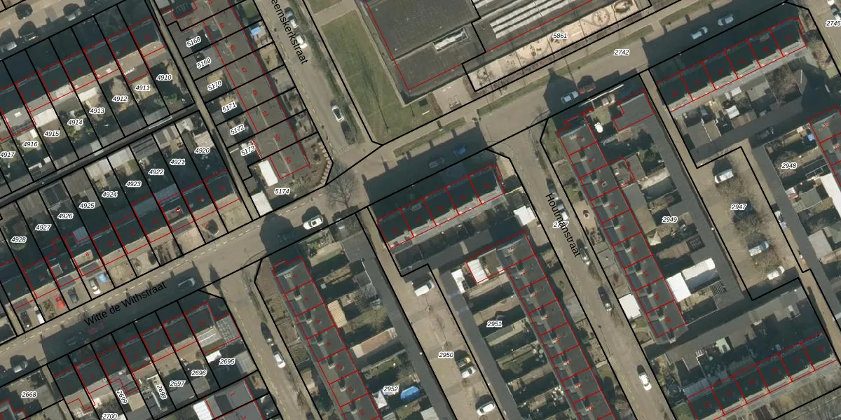 Het perceel waarop Witte de Withstraat 17 staat heeft een oppervlakte van 2600 m². Dit is een zeer groot perceel. De perceeloppervlakte wordt geregistreerd door het Kadaster. Gedetailleerde informatie over de maten van dit perceel kunt u vinden in het rapport Kadastrale kaart met maatvoering van Witte de Withstraat 17.