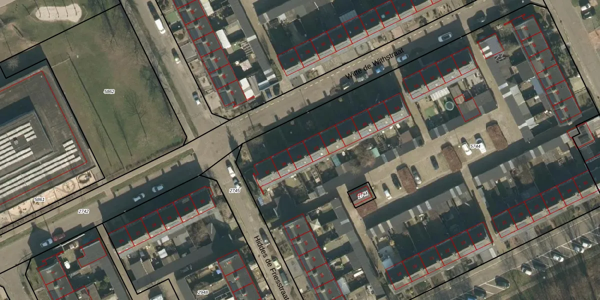 Het perceel waarop Witte de Withstraat 41 staat heeft een oppervlakte van 7855 m². Dit is een zeer groot perceel. De perceeloppervlakte wordt geregistreerd door het Kadaster. Gedetailleerde informatie over de maten van dit perceel kunt u vinden in het rapport Kadastrale kaart met maatvoering van Witte de Withstraat 41.