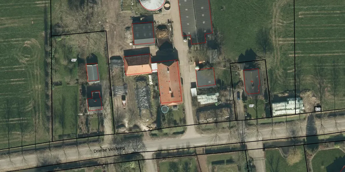 Het perceel waarop Drielse Veldweg 4 staat heeft een oppervlakte van 4,3 ha. Dit is een zeer groot perceel. De perceeloppervlakte wordt geregistreerd door het Kadaster. Gedetailleerde informatie over de maten van dit perceel kunt u vinden in het rapport Kadastrale kaart met maatvoering van Drielse Veldweg 4.
