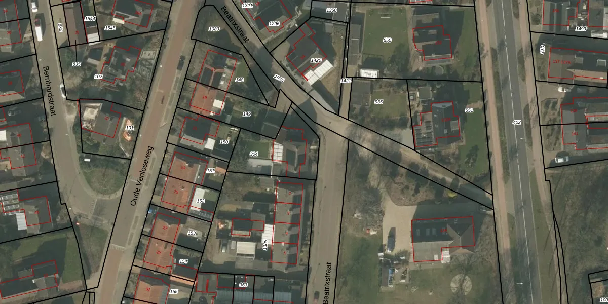 Beatrixstraat 1 is gelegen op kadastraal perceel ACN00E304. Deze kadastrale aanduiding is uniek en wordt gebruikt door het Kadaster om eigendomsrechten en andere zakelijke rechten vast te leggen. Het perceel maakt onderdeel uit van de kadastrale gemeente Arcen en Velden.