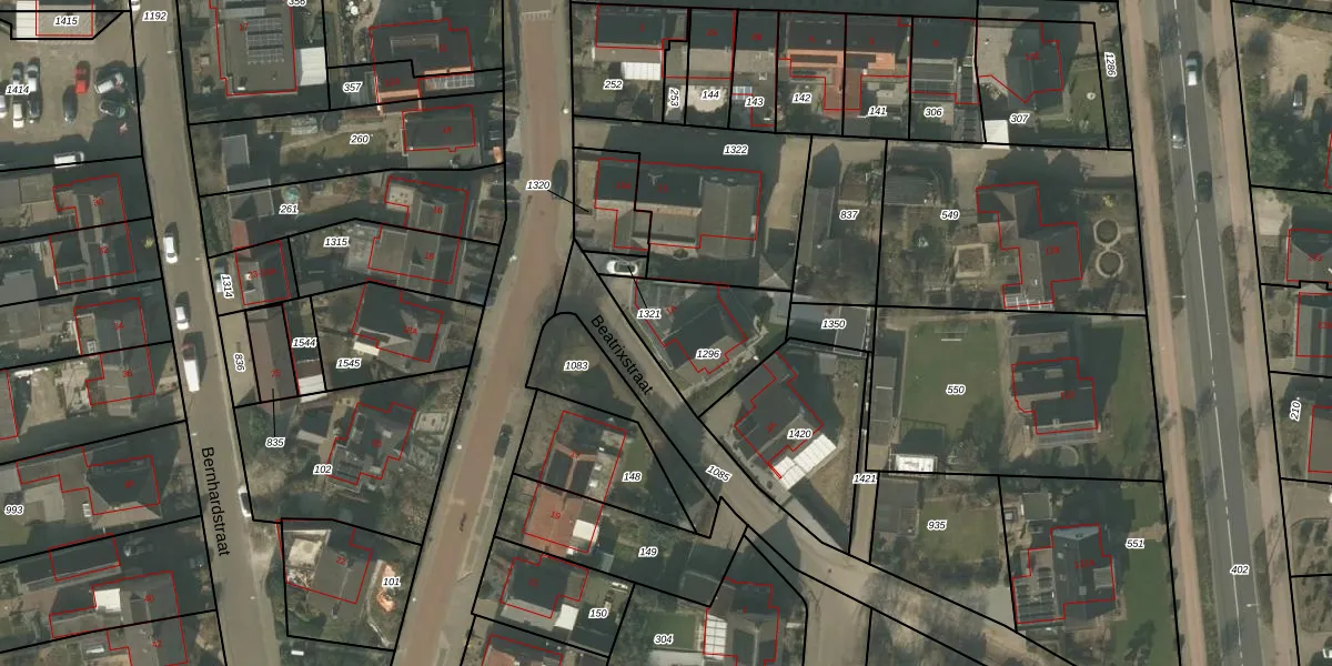 Het perceel waarop Beatrixstraat 1-A staat heeft een oppervlakte van 345 m². Dit is een groot perceel. De perceeloppervlakte wordt geregistreerd door het Kadaster. Gedetailleerde informatie over de maten van dit perceel kunt u vinden in het rapport Kadastrale kaart met maatvoering van Beatrixstraat 1-A.