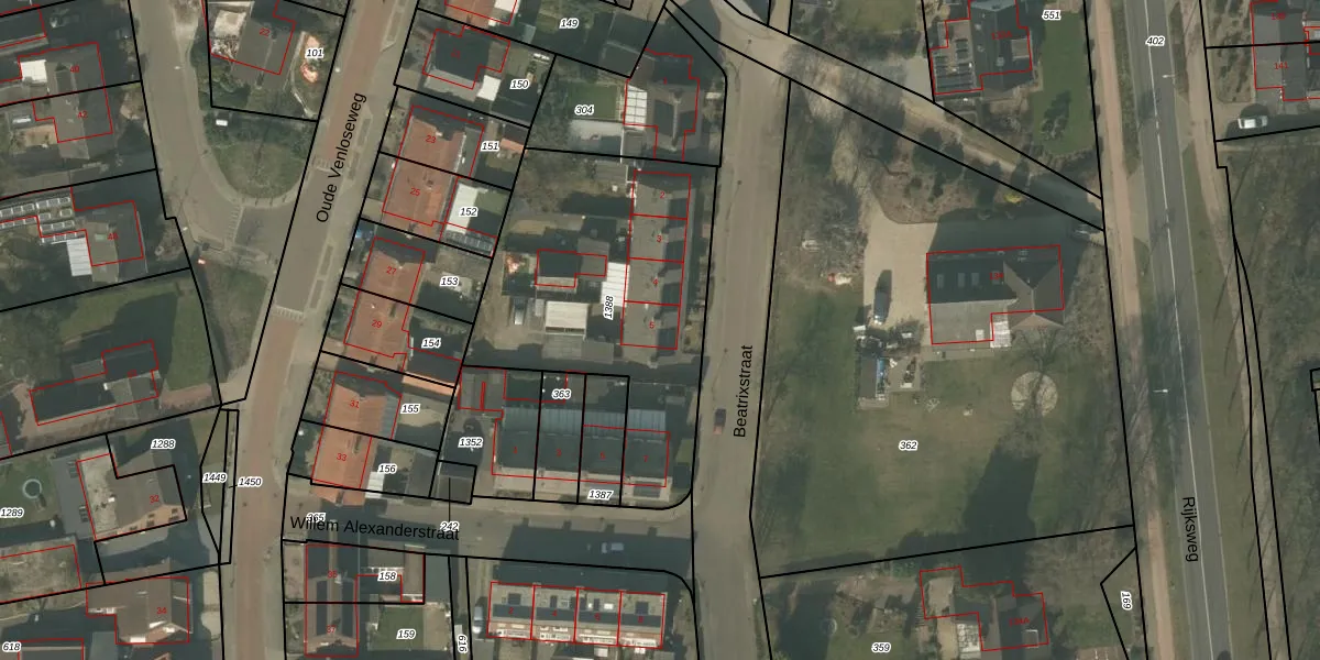 Beatrixstraat 5 is gelegen op kadastraal perceel ACN00E1388. Deze kadastrale aanduiding is uniek en wordt gebruikt door het Kadaster om eigendomsrechten en andere zakelijke rechten vast te leggen. Het perceel maakt onderdeel uit van de kadastrale gemeente Arcen en Velden.