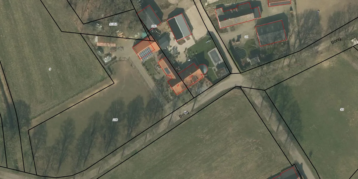 Het perceel waarop Bong 24 staat heeft een oppervlakte van 3655 m². Dit is een zeer groot perceel. De perceeloppervlakte wordt geregistreerd door het Kadaster. Gedetailleerde informatie over de maten van dit perceel kunt u vinden in het rapport Kadastrale kaart met maatvoering van Bong 24.