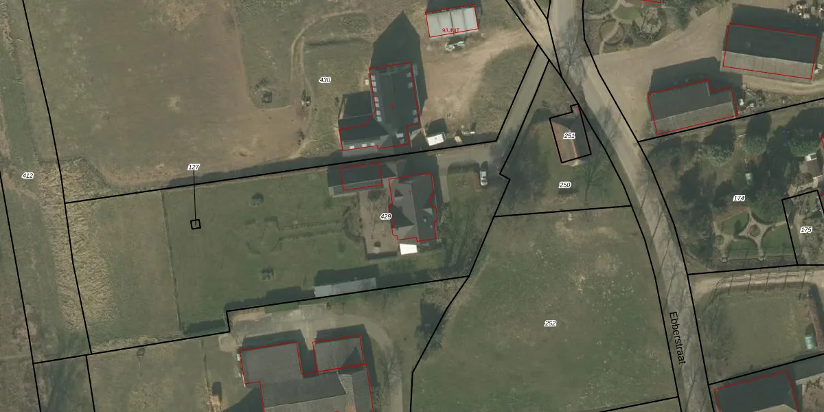 Ebberstraat 7 is gelegen op kadastraal perceel ACN00H429. Deze kadastrale aanduiding is uniek en wordt gebruikt door het Kadaster om eigendomsrechten en andere zakelijke rechten vast te leggen. Het perceel maakt onderdeel uit van de kadastrale gemeente Arcen en Velden.