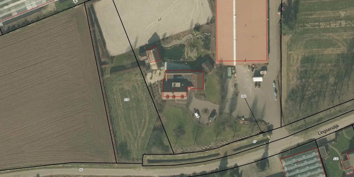 Het perceel waarop Lingsendijk 15 staat heeft een oppervlakte van 2,0 ha. Dit is een zeer groot perceel. De perceeloppervlakte wordt geregistreerd door het Kadaster. Gedetailleerde informatie over de maten van dit perceel kunt u vinden in het rapport Kadastrale kaart met maatvoering van Lingsendijk 15.