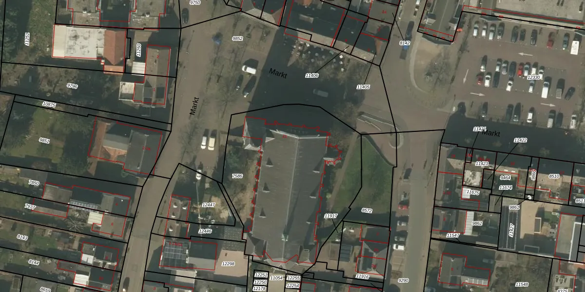 Het perceel waarop Markt 21 staat heeft een oppervlakte van 2221 m². Dit is een zeer groot perceel. De perceeloppervlakte wordt geregistreerd door het Kadaster. Gedetailleerde informatie over de maten van dit perceel kunt u vinden in het rapport Kadastrale kaart met maatvoering van Markt 21.