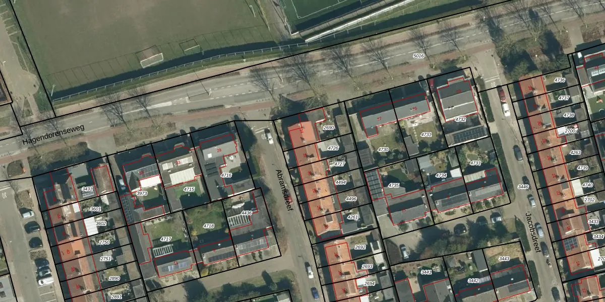Gebruik de zoekbalk of klik op een perceel voor informatie over de adressen binnen dit perceel.
