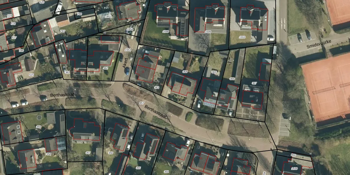 Het perceel waarop Berthastraat 5 staat heeft een oppervlakte van 562 m². Dit is een groot perceel. De perceeloppervlakte wordt geregistreerd door het Kadaster. Gedetailleerde informatie over de maten van dit perceel kunt u vinden in het rapport Kadastrale kaart met maatvoering van Berthastraat 5.
