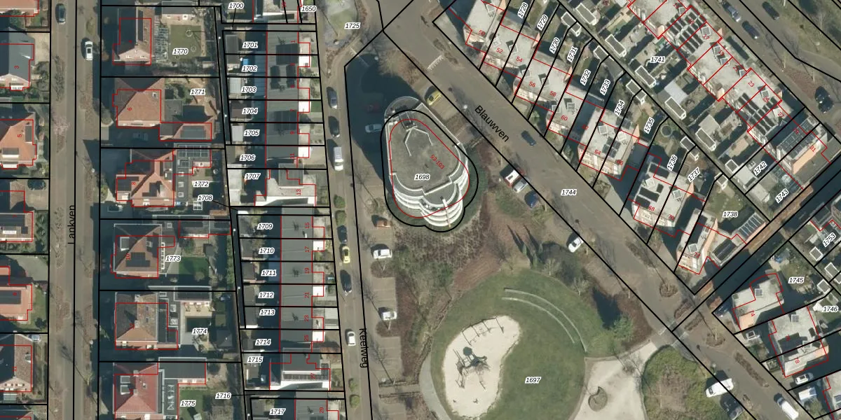 Het perceel waarop Blauwven 101 staat heeft een oppervlakte van 491 m². Dit is een groot perceel. De perceeloppervlakte wordt geregistreerd door het Kadaster. Gedetailleerde informatie over de maten van dit perceel kunt u vinden in het rapport Kadastrale kaart met maatvoering van Blauwven 101.
