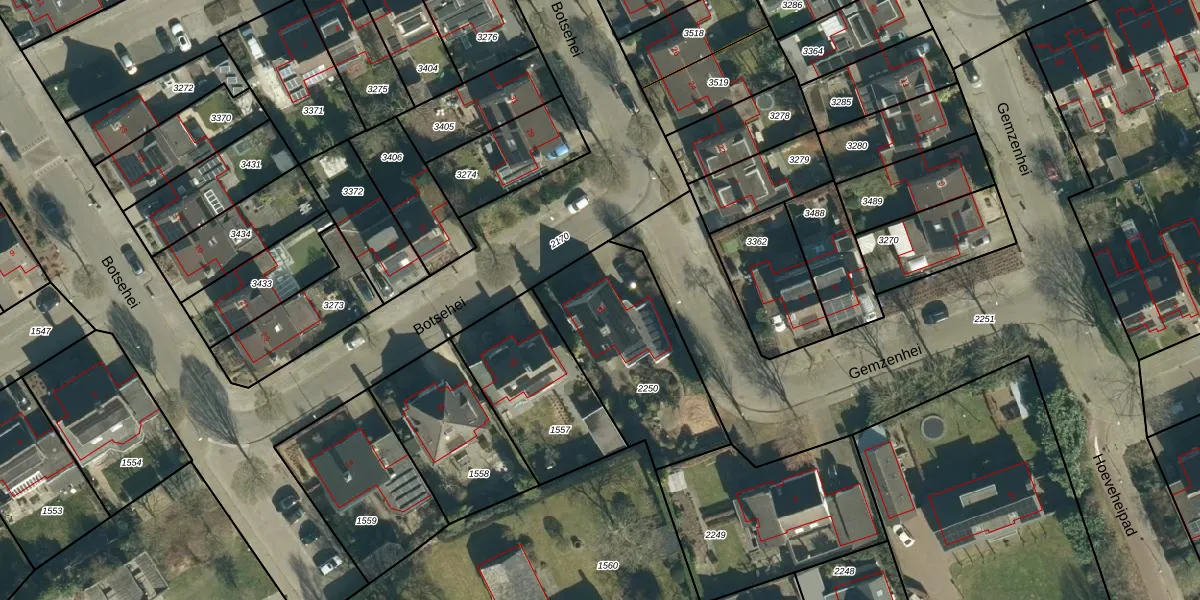 Het perceel waarop Botsehei 20 staat heeft een oppervlakte van 631 m². Dit is een groot perceel. De perceeloppervlakte wordt geregistreerd door het Kadaster. Gedetailleerde informatie over de maten van dit perceel kunt u vinden in het rapport Kadastrale kaart met maatvoering van Botsehei 20.