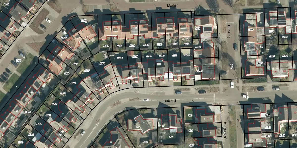 Het perceel waarop Buizerd 150 staat heeft een oppervlakte van 223 m². Dit is een middelgroot perceel. De perceeloppervlakte wordt geregistreerd door het Kadaster. Gedetailleerde informatie over de maten van dit perceel kunt u vinden in het rapport Kadastrale kaart met maatvoering van Buizerd 150.