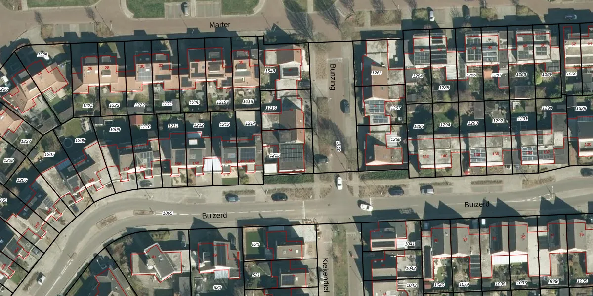 Bunzing 1 is gelegen op kadastraal perceel VHV01F1215. Deze kadastrale aanduiding is uniek en wordt gebruikt door het Kadaster om eigendomsrechten en andere zakelijke rechten vast te leggen. Het perceel maakt onderdeel uit van de kadastrale gemeente Veldhoven.