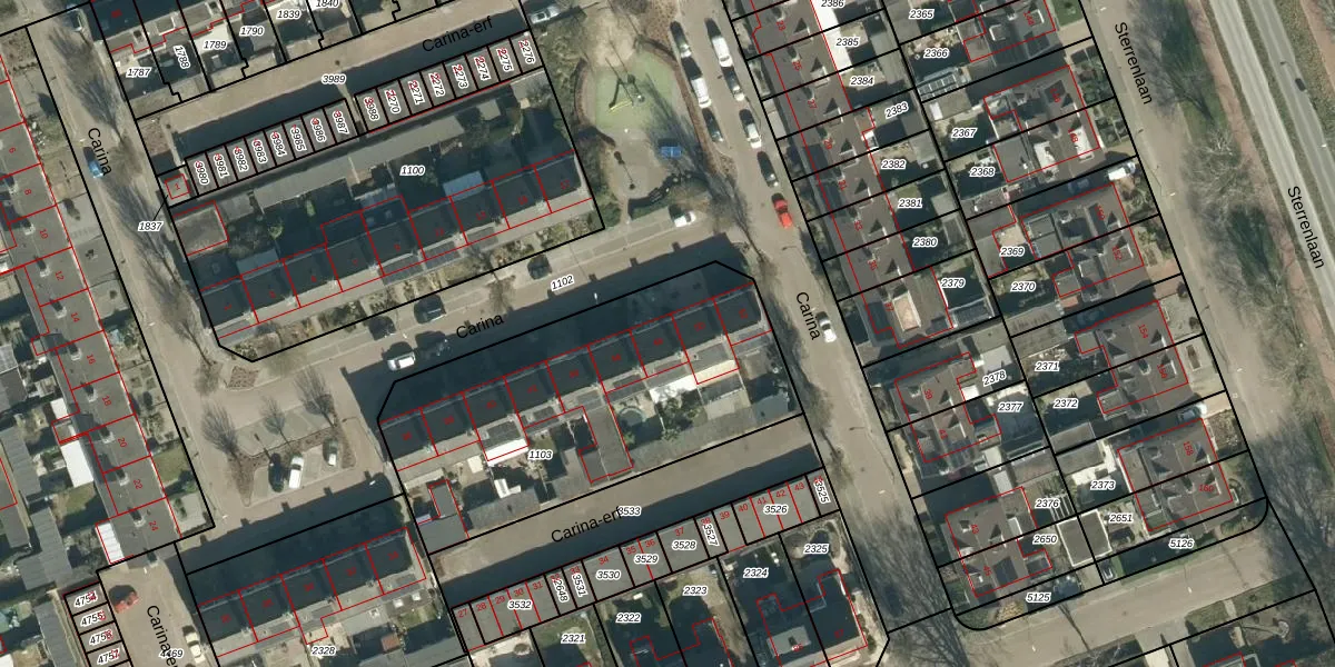 Het perceel waarop Carina 48 staat heeft een oppervlakte van 1550 m². Dit is een zeer groot perceel. De perceeloppervlakte wordt geregistreerd door het Kadaster. Gedetailleerde informatie over de maten van dit perceel kunt u vinden in het rapport Kadastrale kaart met maatvoering van Carina 48.