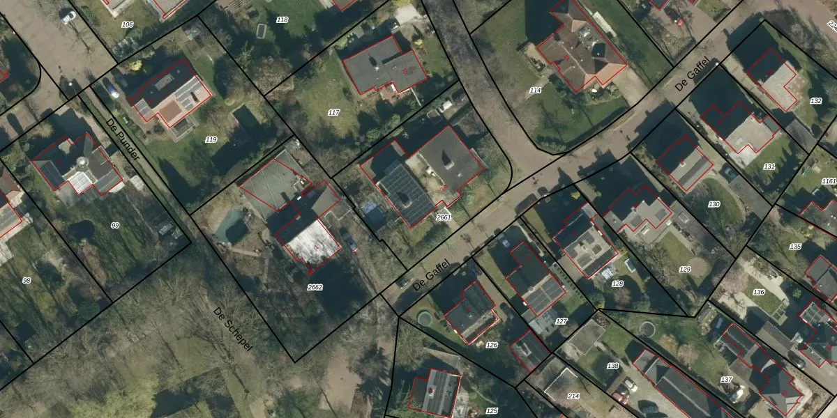 Het perceel waarop De Gaffel 3 staat heeft een oppervlakte van 1025 m². Dit is een zeer groot perceel. De perceeloppervlakte wordt geregistreerd door het Kadaster. Gedetailleerde informatie over de maten van dit perceel kunt u vinden in het rapport Kadastrale kaart met maatvoering van De Gaffel 3.