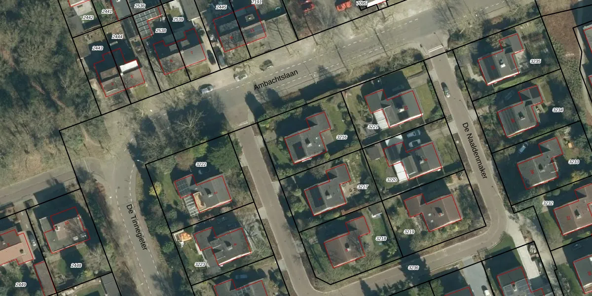 De Naaldenmaker 1 is gelegen op kadastraal perceel VHV01E3216. Deze kadastrale aanduiding is uniek en wordt gebruikt door het Kadaster om eigendomsrechten en andere zakelijke rechten vast te leggen. Het perceel maakt onderdeel uit van de kadastrale gemeente Veldhoven.