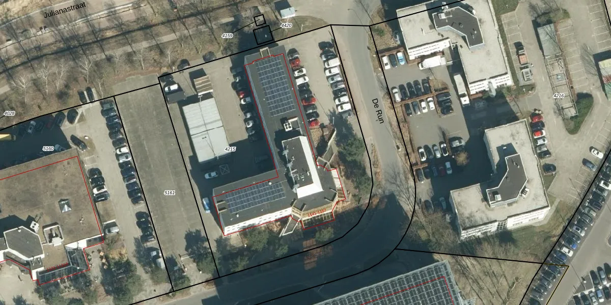 Het adres is gelegen op perceel 4215 in de sectie D en de kadastrale gemeente Veldhoven. De kadastrale aanduiding is aldus VHV01-D-4215. De oppervlakte van het perceel is 3904 m². Dat is groter dan gemiddeld in Veldhoven, waar de gemiddelde perceeloppervlakte op 1485,6 m² ligt. Het grootste perceel in de kadastrale gemeente is 78,9 ha. Het kleinste perceel heeft een oppervlakte van 0 m². Op het perceel liggen in totaal 9 adressen. De huidige grenzen van het perceel zijn digitaal in de Basisregistratie Kadaster (BRK) geregistreerd op 11-01-2011.
