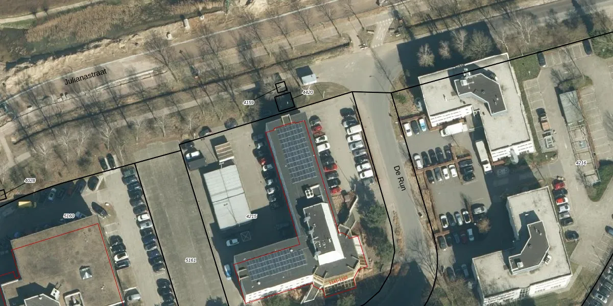 Het adres is gelegen op perceel 4215 in de sectie D en de kadastrale gemeente Veldhoven. De kadastrale aanduiding is aldus VHV01-D-4215. De oppervlakte van het perceel is 3904 m². Dat is groter dan gemiddeld in Veldhoven, waar de gemiddelde perceeloppervlakte op 1485,6 m² ligt. Het grootste perceel in de kadastrale gemeente is 78,9 ha. Het kleinste perceel heeft een oppervlakte van 0 m². Er zijn 9 adressen aanwezig op het perceel. De huidige grenzen van het perceel zijn digitaal in de Basisregistratie Kadaster (BRK) geregistreerd op 11-01-2011.