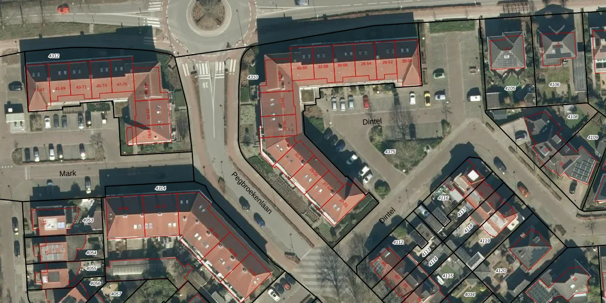 Het perceel waarop Dintel 31 staat heeft een oppervlakte van 2235 m². Dit is een zeer groot perceel. De perceeloppervlakte wordt geregistreerd door het Kadaster. Gedetailleerde informatie over de maten van dit perceel kunt u vinden in het rapport Kadastrale kaart met maatvoering van Dintel 31.