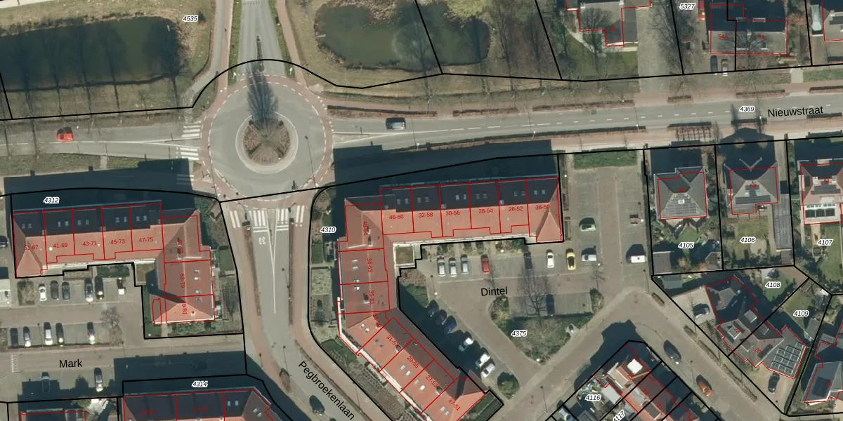 Het perceel waarop Dintel 44 staat heeft een oppervlakte van 2235 m². Dit is een zeer groot perceel. De perceeloppervlakte wordt geregistreerd door het Kadaster. Gedetailleerde informatie over de maten van dit perceel kunt u vinden in het rapport Kadastrale kaart met maatvoering van Dintel 44.