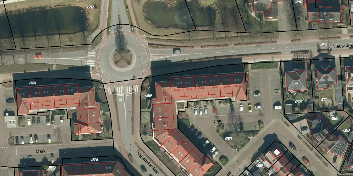Het perceel waarop Dintel 46 staat heeft een oppervlakte van 2235 m². Dit is een zeer groot perceel. De perceeloppervlakte wordt geregistreerd door het Kadaster. Gedetailleerde informatie over de maten van dit perceel kunt u vinden in het rapport Kadastrale kaart met maatvoering van Dintel 46.