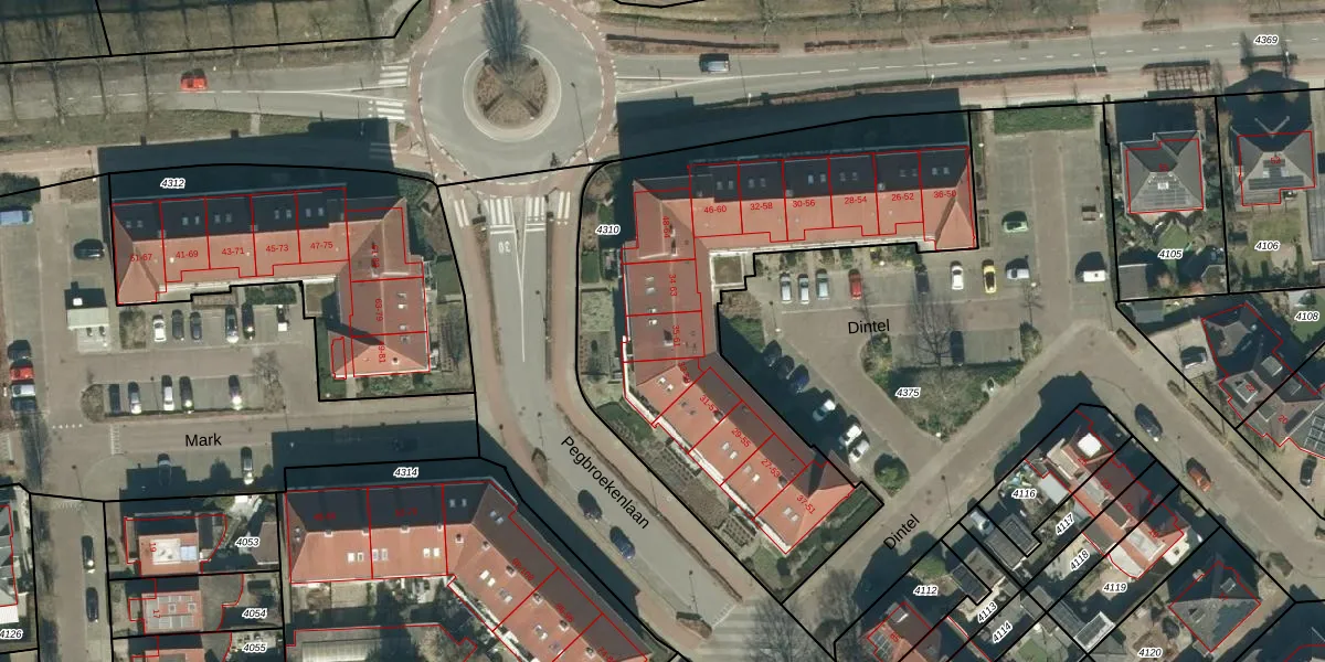 Het perceel waarop Dintel 47 staat heeft een oppervlakte van 2235 m². Dit is een zeer groot perceel. De perceeloppervlakte wordt geregistreerd door het Kadaster. Gedetailleerde informatie over de maten van dit perceel kunt u vinden in het rapport Kadastrale kaart met maatvoering van Dintel 47.