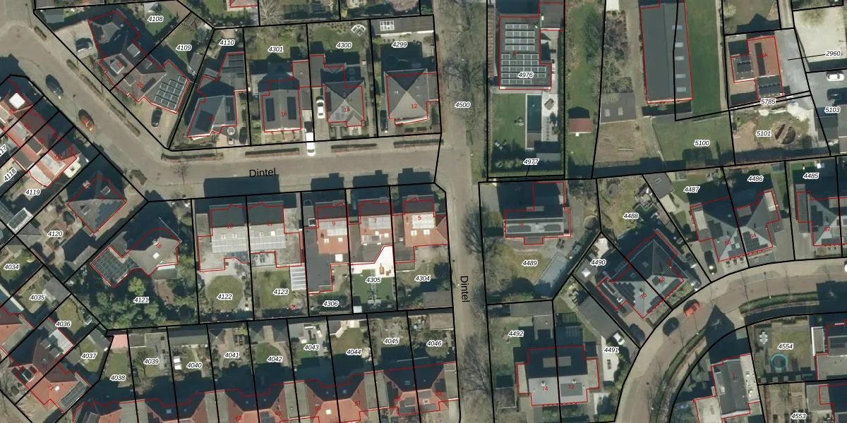 Het perceel waarop Dintel 5 staat heeft een oppervlakte van 384 m². Dit is een groot perceel. De perceeloppervlakte wordt geregistreerd door het Kadaster. Gedetailleerde informatie over de maten van dit perceel kunt u vinden in het rapport Kadastrale kaart met maatvoering van Dintel 5.