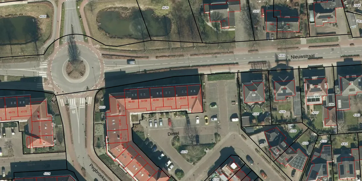 Het perceel waarop Dintel 52 staat heeft een oppervlakte van 2235 m². Dit is een zeer groot perceel. De perceeloppervlakte wordt geregistreerd door het Kadaster. Gedetailleerde informatie over de maten van dit perceel kunt u vinden in het rapport Kadastrale kaart met maatvoering van Dintel 52.