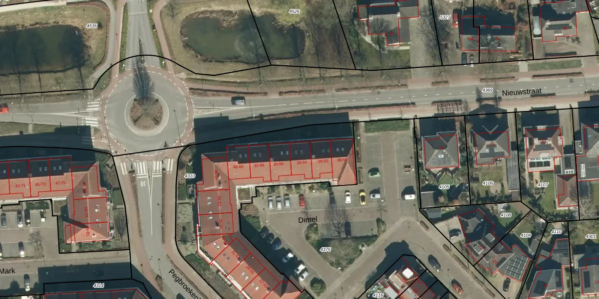 Het perceel waarop Dintel 54 staat heeft een oppervlakte van 2235 m². Dit is een zeer groot perceel. De perceeloppervlakte wordt geregistreerd door het Kadaster. Gedetailleerde informatie over de maten van dit perceel kunt u vinden in het rapport Kadastrale kaart met maatvoering van Dintel 54.