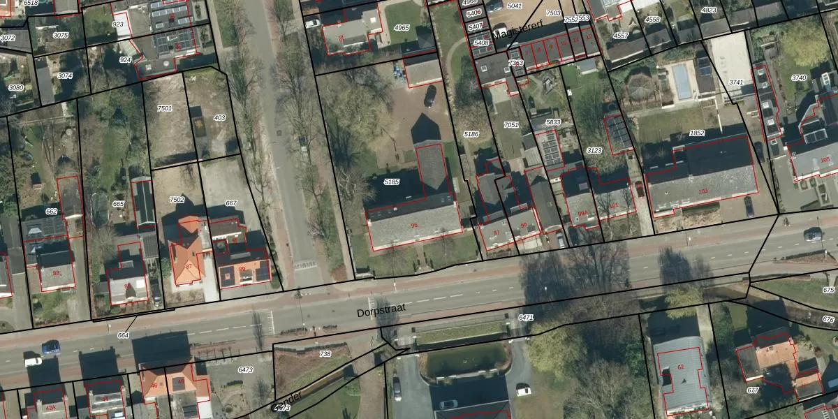 Dorpstraat 95 is gelegen op kadastraal perceel VHV01E5185. Deze kadastrale aanduiding is uniek en wordt gebruikt door het Kadaster om eigendomsrechten en andere zakelijke rechten vast te leggen. Het perceel maakt onderdeel uit van de kadastrale gemeente Veldhoven.