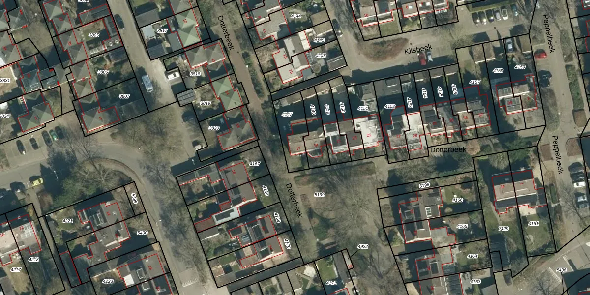 Dotterbeek 17 is gelegen op kadastraal perceel VHV01E4147. Deze kadastrale aanduiding is uniek en wordt gebruikt door het Kadaster om eigendomsrechten en andere zakelijke rechten vast te leggen. Het perceel maakt onderdeel uit van de kadastrale gemeente Veldhoven.
