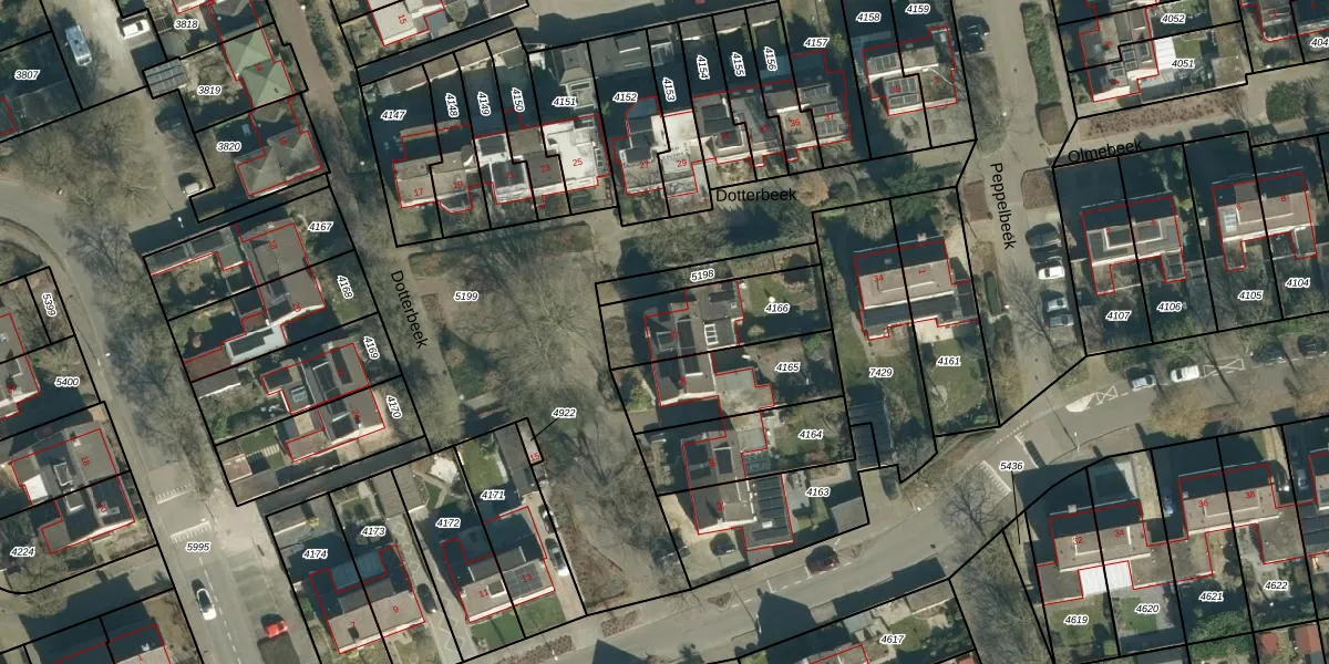 Dotterbeek 32 is gelegen op kadastraal perceel VHV01E4166. Deze kadastrale aanduiding is uniek en wordt gebruikt door het Kadaster om eigendomsrechten en andere zakelijke rechten vast te leggen. Het perceel maakt onderdeel uit van de kadastrale gemeente Veldhoven.