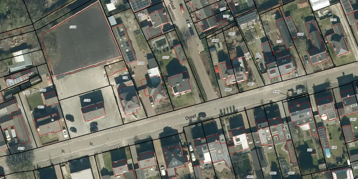 Het perceel waarop Dreef 15 staat heeft een oppervlakte van 710 m². Dit is een groot perceel. De perceeloppervlakte wordt geregistreerd door het Kadaster. Gedetailleerde informatie over de maten van dit perceel kunt u vinden in het rapport Kadastrale kaart met maatvoering van Dreef 15.