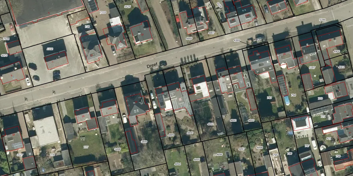 Het perceel waarop Dreef 20 staat heeft een oppervlakte van 467 m². Dit is een groot perceel. De perceeloppervlakte wordt geregistreerd door het Kadaster. Gedetailleerde informatie over de maten van dit perceel kunt u vinden in het rapport Kadastrale kaart met maatvoering van Dreef 20.