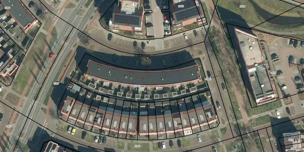 Het perceel waarop Eekhoorn 21 staat heeft een oppervlakte van 1835 m². Dit is een zeer groot perceel. De perceeloppervlakte wordt geregistreerd door het Kadaster. Gedetailleerde informatie over de maten van dit perceel kunt u vinden in het rapport Kadastrale kaart met maatvoering van Eekhoorn 21.