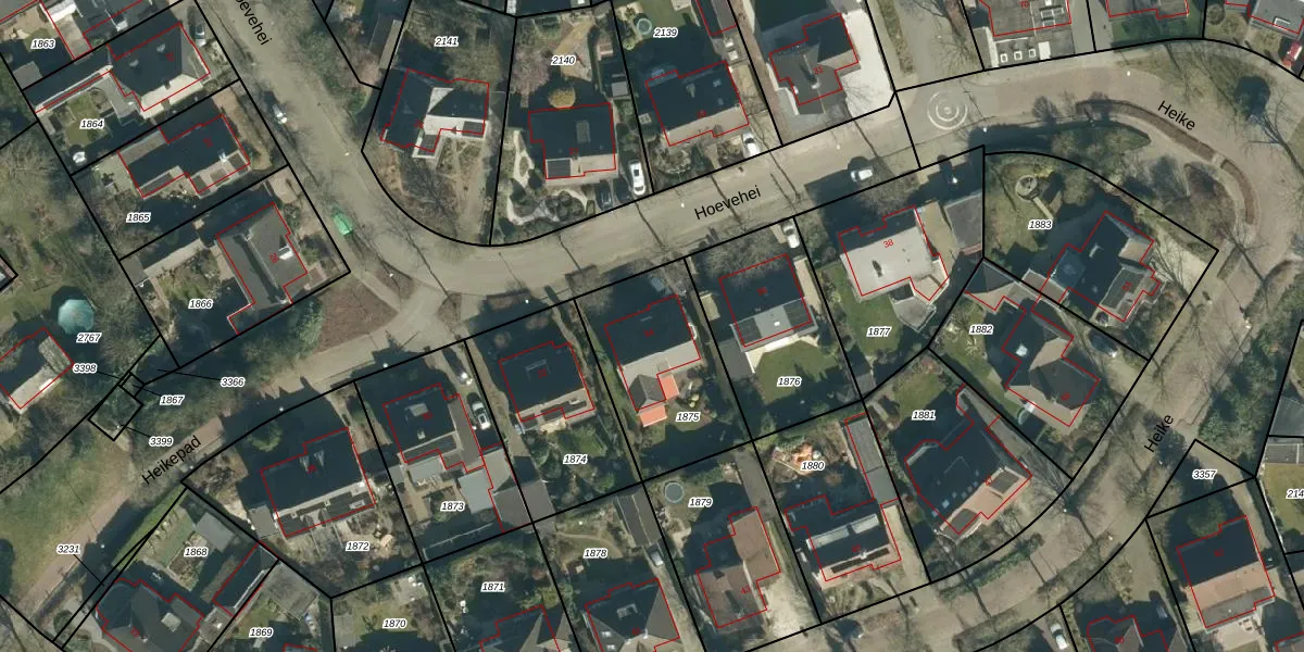 Hoevehei 34 is gelegen op kadastraal perceel VHV01I1875. Deze kadastrale aanduiding is uniek en wordt gebruikt door het Kadaster om eigendomsrechten en andere zakelijke rechten vast te leggen. Het perceel maakt onderdeel uit van de kadastrale gemeente Veldhoven.