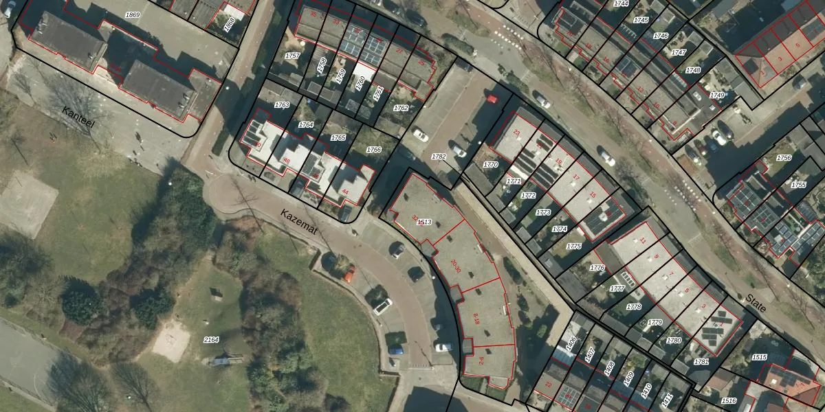 Het perceel waarop Kazemat 38 staat heeft een oppervlakte van 1264 m². Dit is een zeer groot perceel. De perceeloppervlakte wordt geregistreerd door het Kadaster. Gedetailleerde informatie over de maten van dit perceel kunt u vinden in het rapport Kadastrale kaart met maatvoering van Kazemat 38.