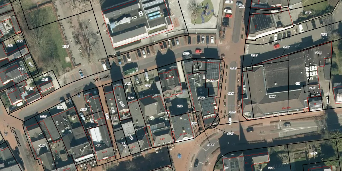 Kerkweg 1-A-E is gelegen op kadastraal perceel VHV01E7270. Deze kadastrale aanduiding is uniek en wordt gebruikt door het Kadaster om eigendomsrechten en andere zakelijke rechten vast te leggen. Het perceel maakt onderdeel uit van de kadastrale gemeente Veldhoven.