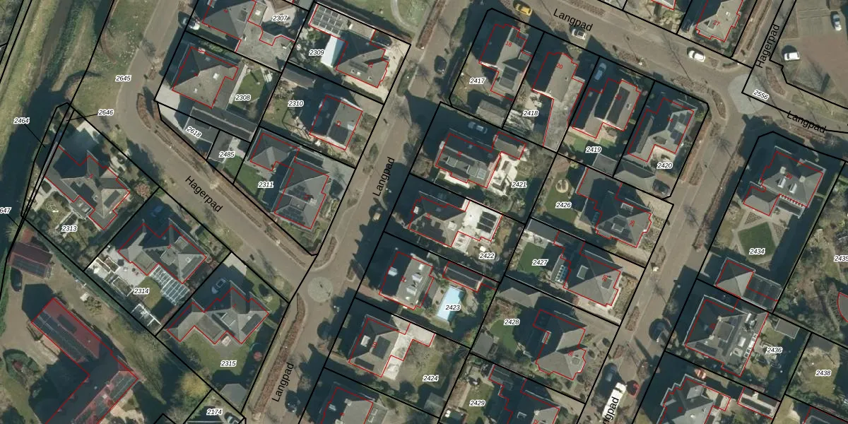 Het perceel waarop Langpad 14 staat heeft een oppervlakte van 452 m². Dit is een groot perceel. De perceeloppervlakte wordt geregistreerd door het Kadaster. Gedetailleerde informatie over de maten van dit perceel kunt u vinden in het rapport Kadastrale kaart met maatvoering van Langpad 14.