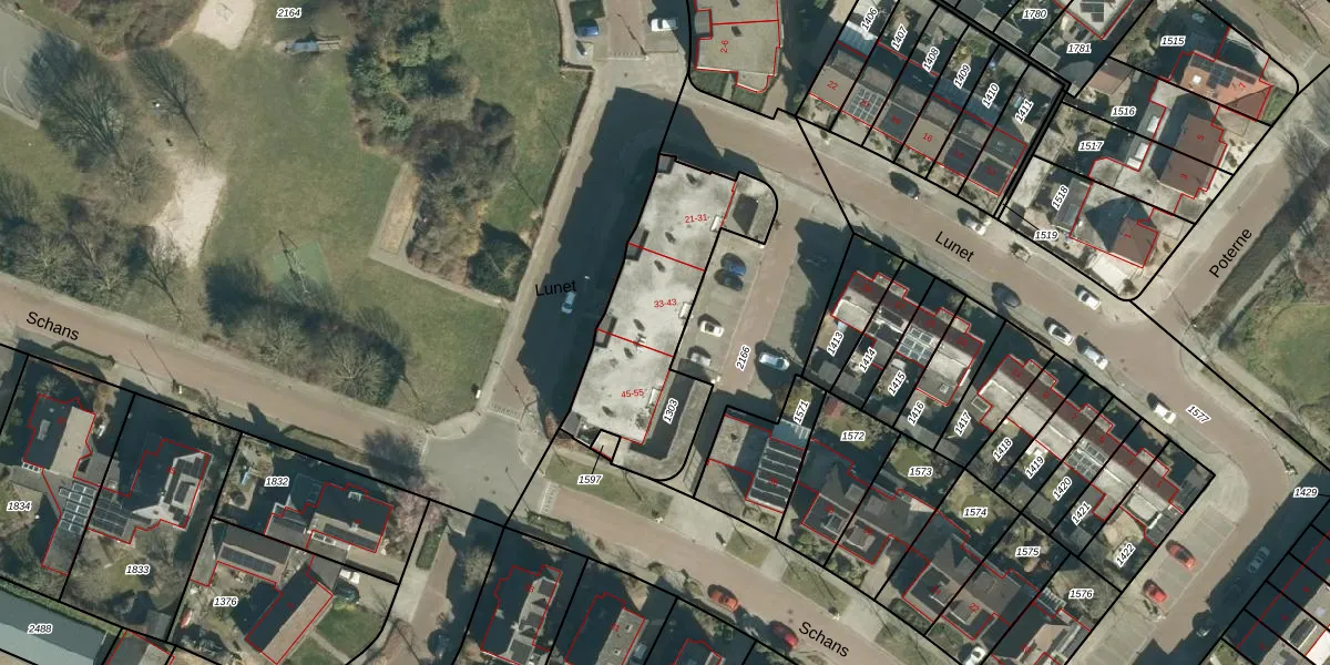 Het perceel waarop Lunet 35 staat heeft een oppervlakte van 705 m². Dit is een groot perceel. De perceeloppervlakte wordt geregistreerd door het Kadaster. Gedetailleerde informatie over de maten van dit perceel kunt u vinden in het rapport Kadastrale kaart met maatvoering van Lunet 35.