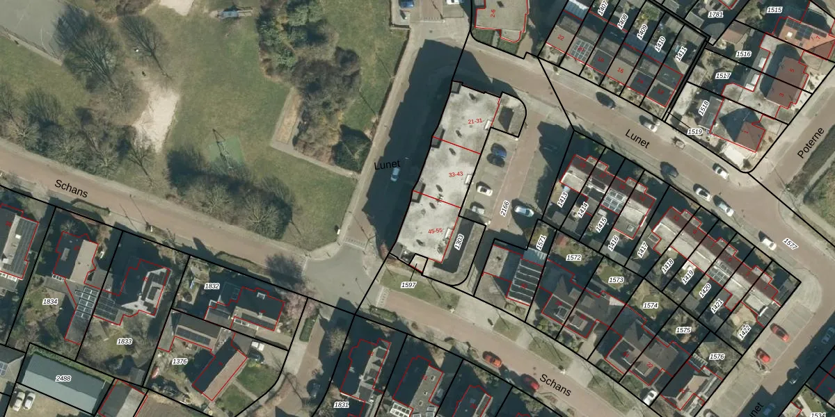 Het perceel waarop Lunet 53 staat heeft een oppervlakte van 705 m². Dit is een groot perceel. De perceeloppervlakte wordt geregistreerd door het Kadaster. Gedetailleerde informatie over de maten van dit perceel kunt u vinden in het rapport Kadastrale kaart met maatvoering van Lunet 53.