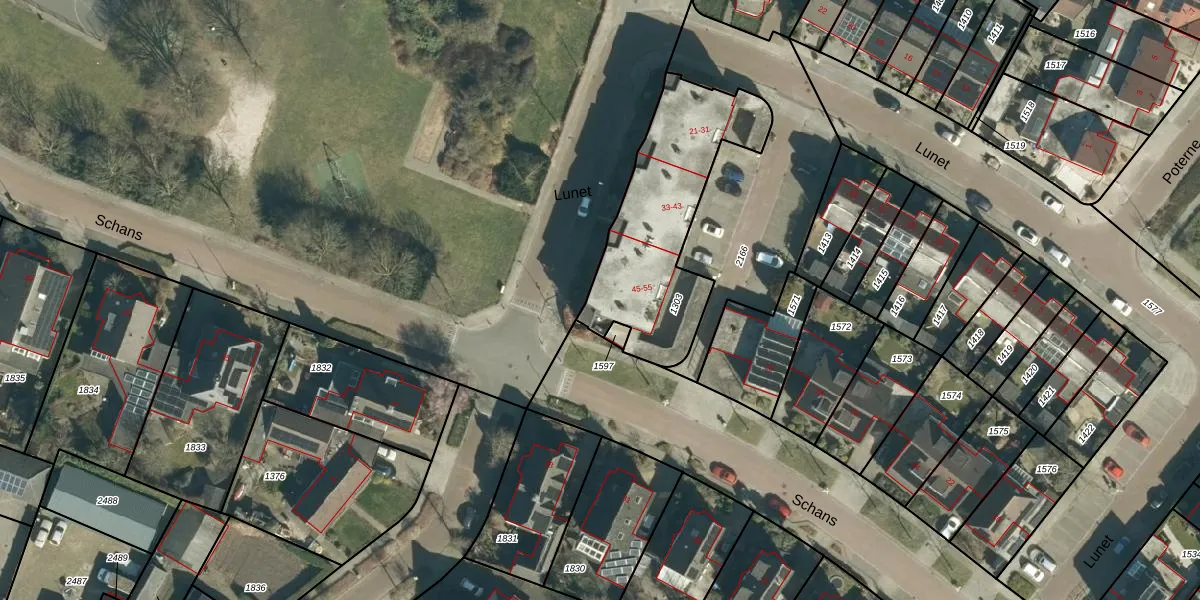 Het perceel waarop Lunet 55 staat heeft een oppervlakte van 705 m². Dit is een groot perceel. De perceeloppervlakte wordt geregistreerd door het Kadaster. Gedetailleerde informatie over de maten van dit perceel kunt u vinden in het rapport Kadastrale kaart met maatvoering van Lunet 55.