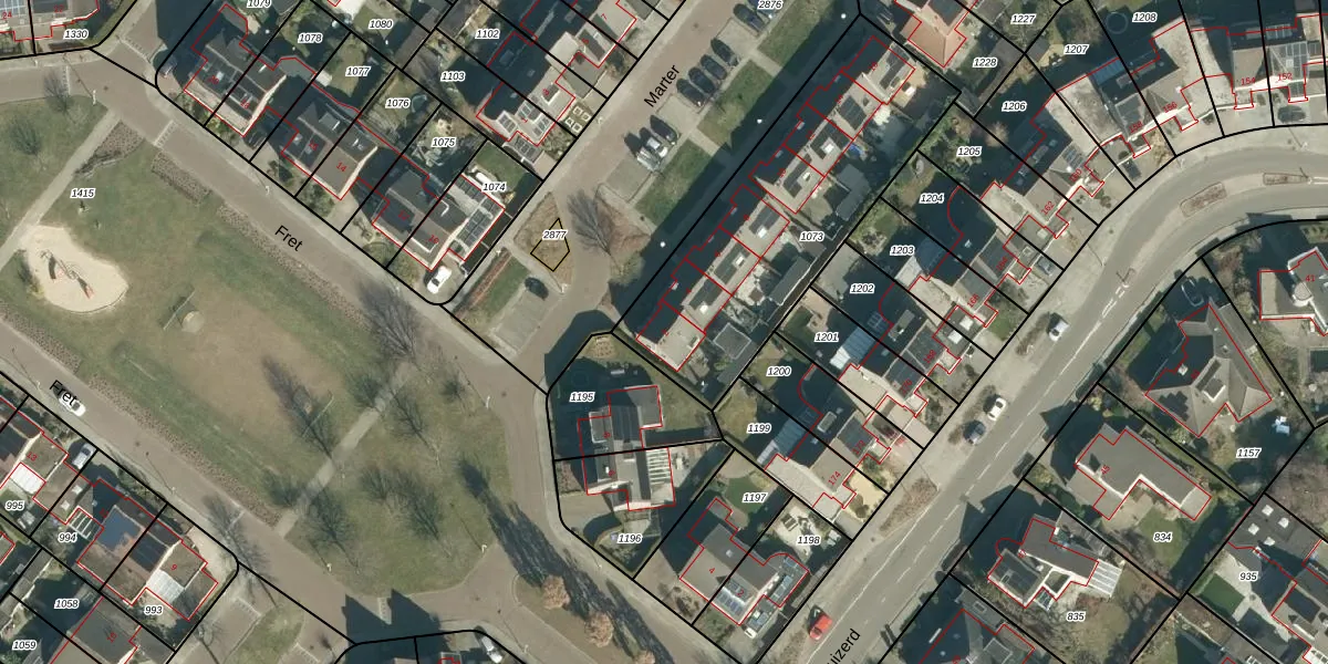 Het perceel waarop Marter 2 staat heeft een oppervlakte van 1174 m². Dit is een zeer groot perceel. De perceeloppervlakte wordt geregistreerd door het Kadaster. Gedetailleerde informatie over de maten van dit perceel kunt u vinden in het rapport Kadastrale kaart met maatvoering van Marter 2.