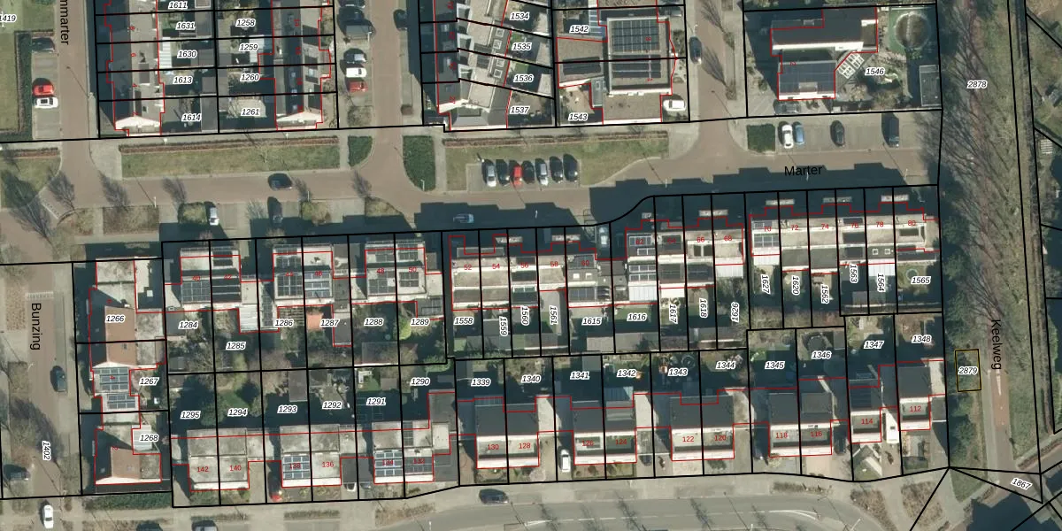 Het perceel waarop Marter 56 staat heeft een oppervlakte van 132 m². Dit is een middelgroot perceel. De perceeloppervlakte wordt geregistreerd door het Kadaster. Gedetailleerde informatie over de maten van dit perceel kunt u vinden in het rapport Kadastrale kaart met maatvoering van Marter 56.