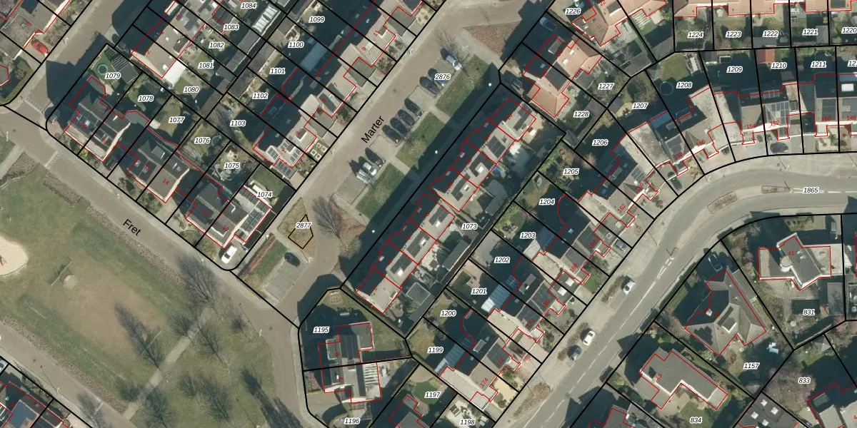 Het perceel waarop Marter 8 staat heeft een oppervlakte van 1174 m². Dit is een zeer groot perceel. De perceeloppervlakte wordt geregistreerd door het Kadaster. Gedetailleerde informatie over de maten van dit perceel kunt u vinden in het rapport Kadastrale kaart met maatvoering van Marter 8.